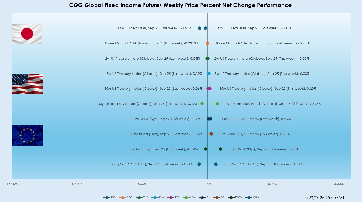 The previous week ended with a negative performance by the OSE 10 Year JGB, Sep 25 contract, falling -0.16%. The best performer in the US market saw the 5yr US Treasury Note (Globex), Sep 25 contract up by +0.12%. The best performer in the European market was the Euro Bund (10yr), Sep 25 contract with a gain of +0.29%