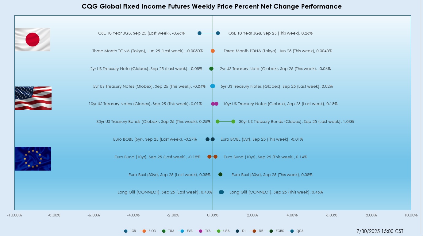 Midweek, the OSE 10 Year JGB, Sep 25 contract is up +0.26%. The best performer in the US market is the 30yr US Treasury Bond (Globex), Sep 25 contract, which is up +0.25%. The best performer in the European market is the Long Gilt, Sep 25 contract with a gain of +0.46%.