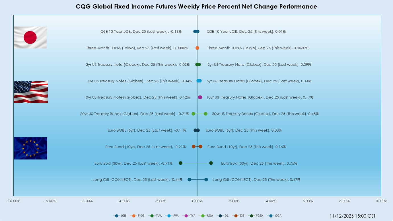 The previous week ended with a negative performance by the OSE 10 Year JGB, Dec 25 contract, falling by -0.13%. The best performer in the US market saw the 10yr US Treasury Note (Globex), Dec 25 contract higher by +0.17%. The best performer in the European market was the Euro BOBL (5 Yr), Dec 25 contract with a loss of -0.11%.