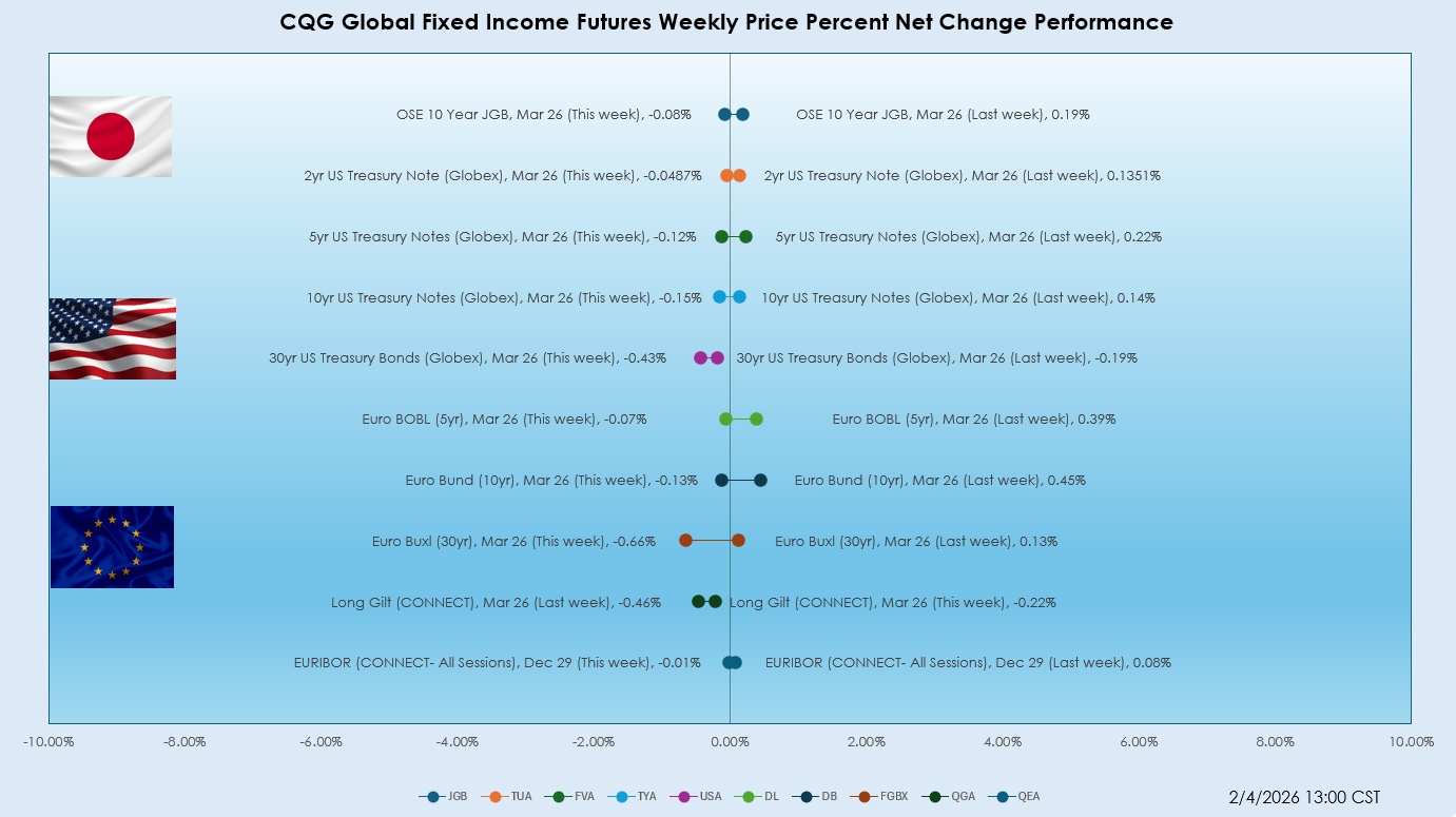 The previous week ended with a positive performance by the OSE 10 Year JGB, Mar 26 contract, rising by +0.19%. The best performer in the US market saw the 5yr US Treasury Note (Globex), Mar 26 contract higher by +0.22%. The best performer in the European market was the Euro Bund (10yr), Mar 26 contract with a gain of +0.45%.