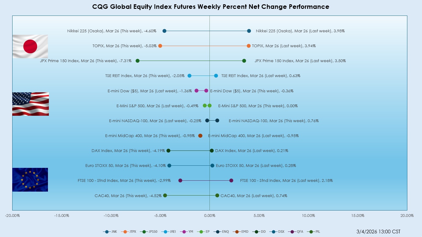 This midweek look shows the Nikkei 225 (Osaka), Mar 26 contract, down with a loss of -4.60%. The best performer in the US market is the E-mini NASDAQ 100, Mar 26 contract showing a gain of +0.76%. The best performer in the European market is the FTSE 100, Mar 26 contract with a -2.99% loss.