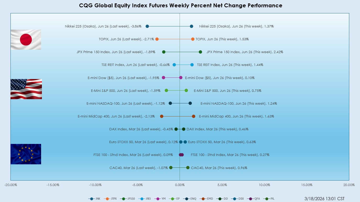 The previous week in the Japanese market the Nikkei 225 (Osaka), Jun 26 contract fell by -3.86%. The best performer last week in the US market was the E-mini NASDAQ 100, Jun 26 contract, which fell by -1.12%. The best performer last week in the European market was the Euro STOXX 500, Mar 26 contract with a gain of +0.12%.