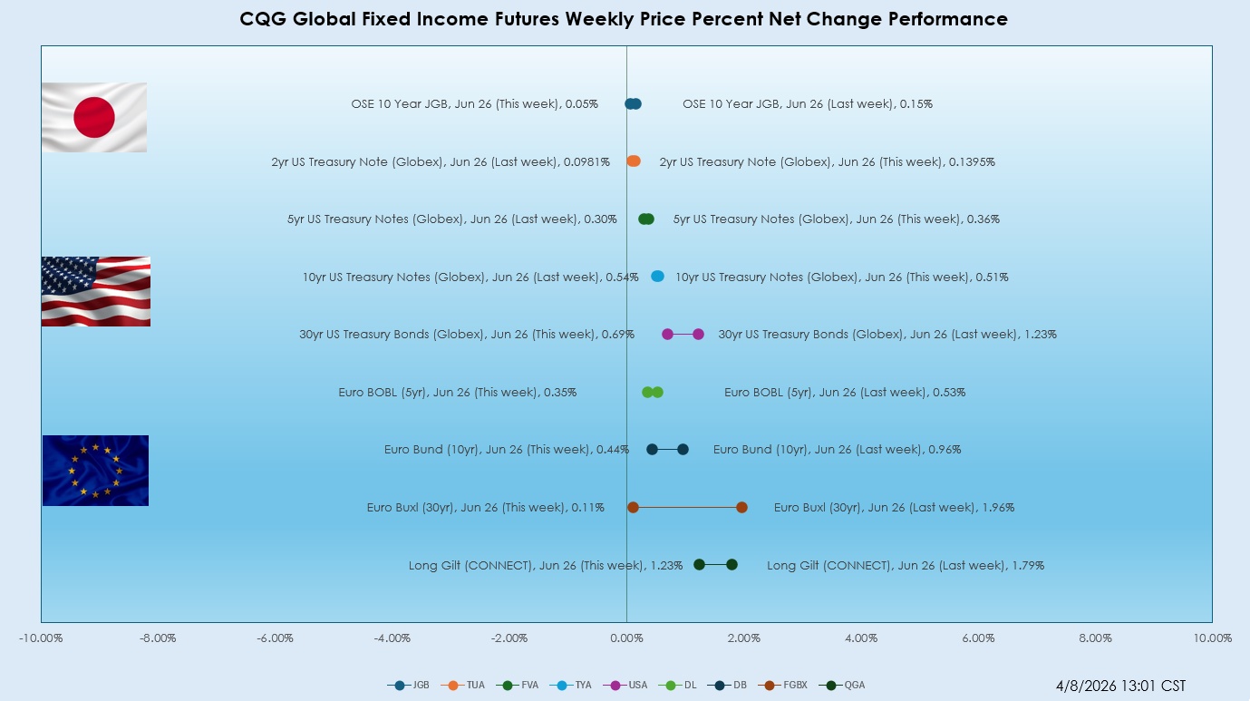 The previous week ended with a gain by the OSE 10 Year JGB, Jun 26 contract, rising by +0.15%. The best performer in the US market was the 30yr US Treasury Bond (Globex), Jun 26 contract higher by +1.23%. The best performer in the European market was the Euro Buxl, Jun 26 contract with a gain of +1.96%.