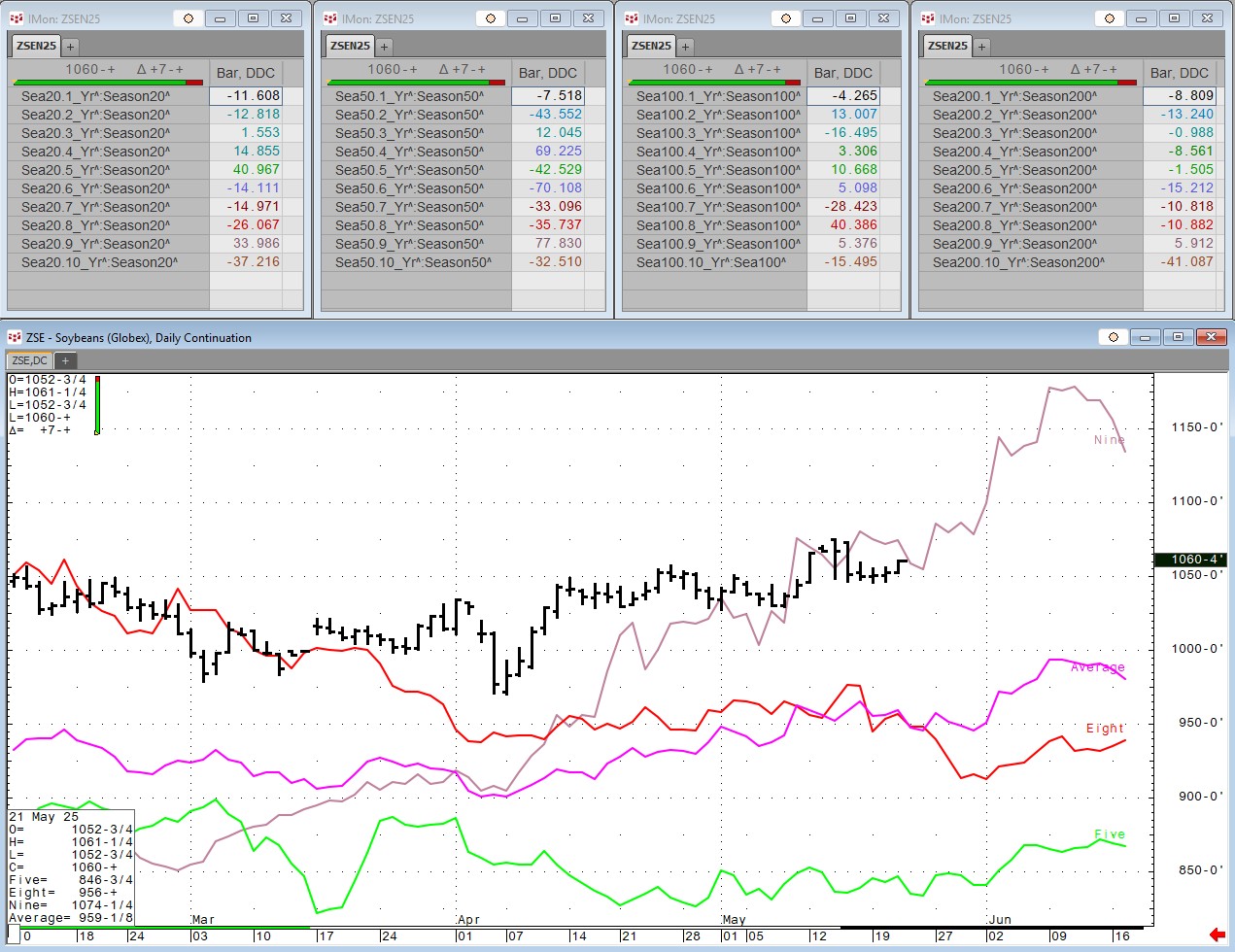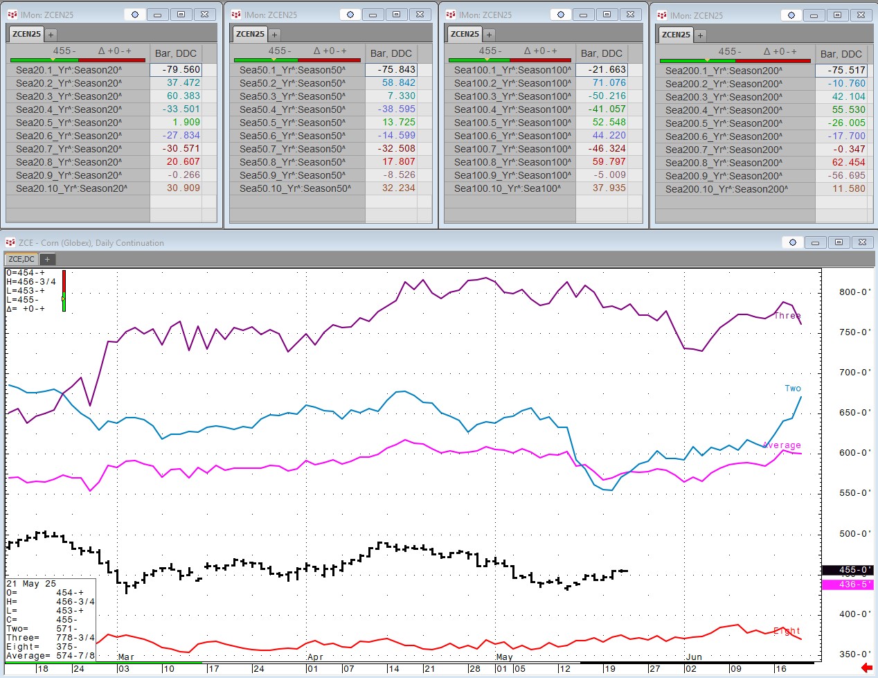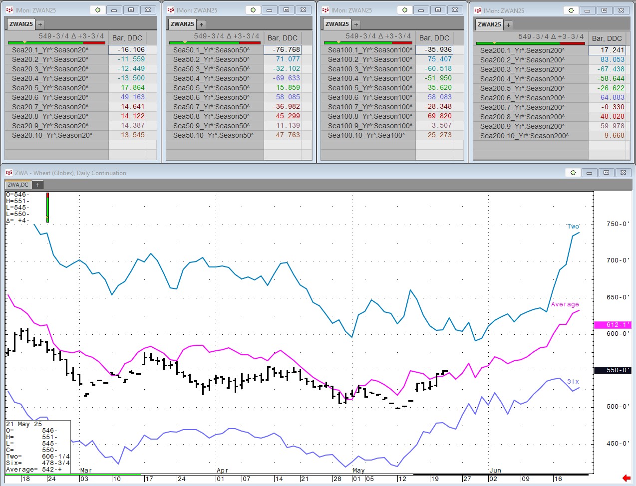 Each Wednesday this article will be updated with the current seasonal study using CQG's Seasonal analysis applied to the Soybean, Wheat and Corn markets. You can download the CQG pac providing the studies and charts here. In addition, the seasonal data lines can be pulled into Excel using RTD formulas.
