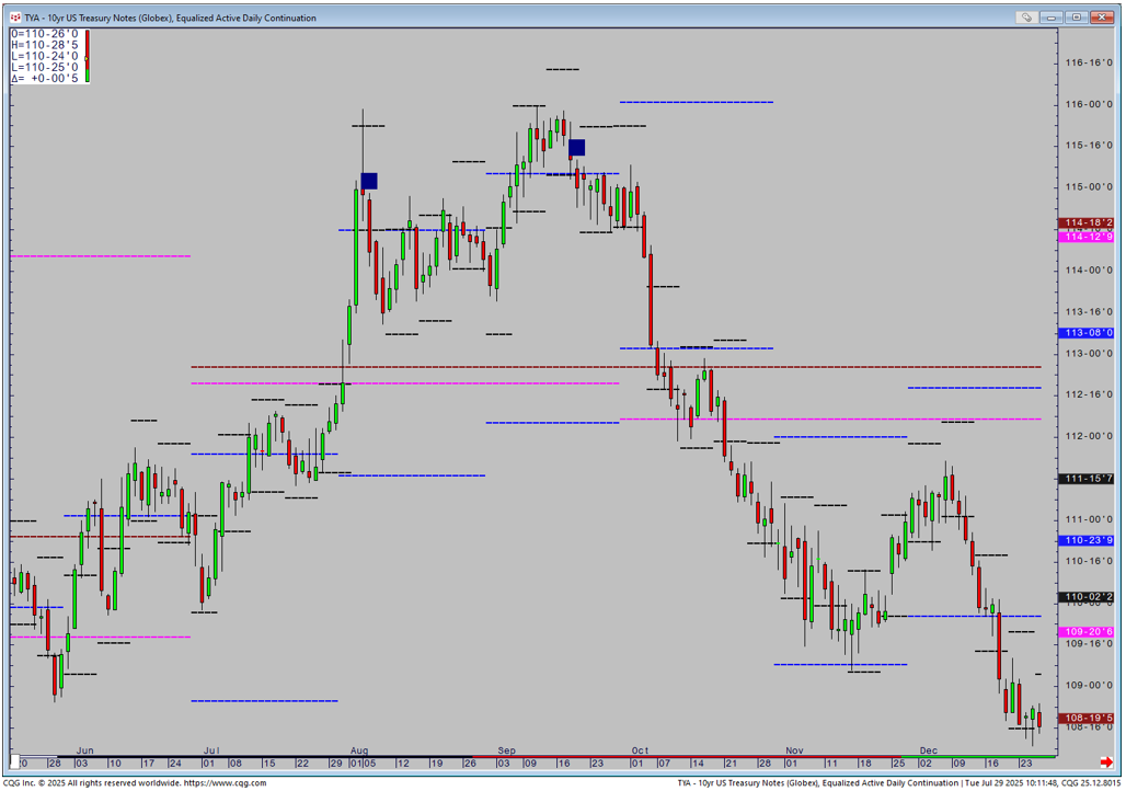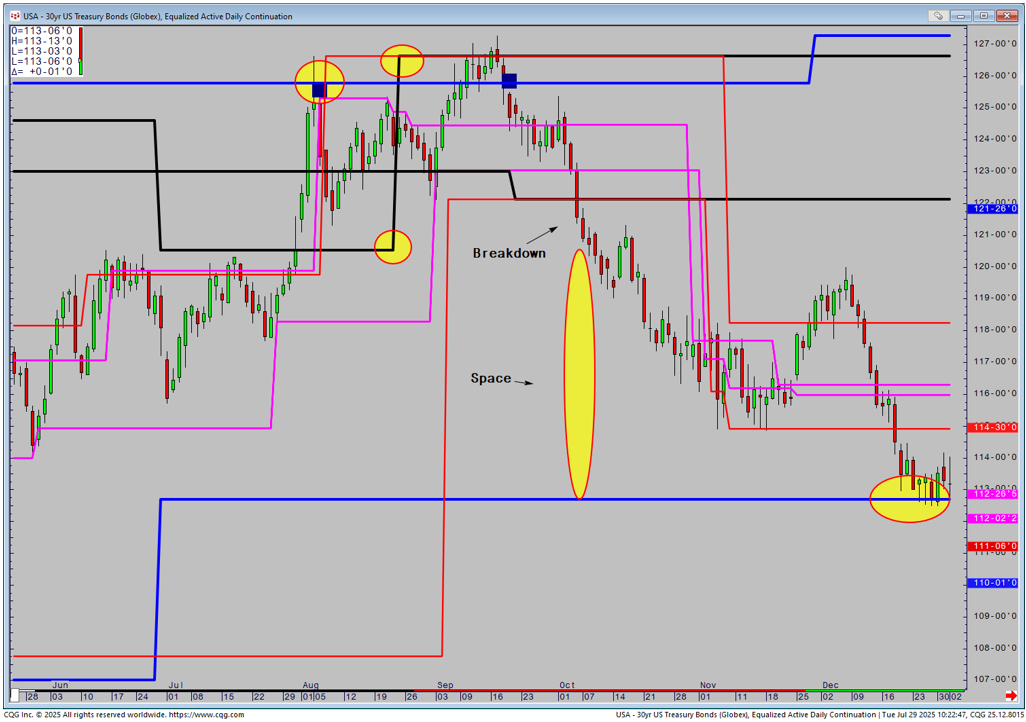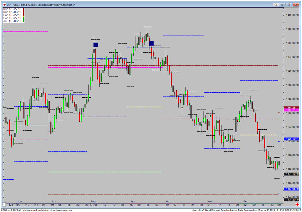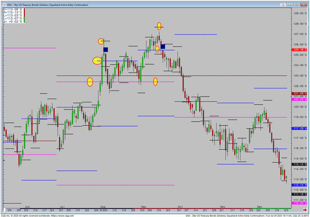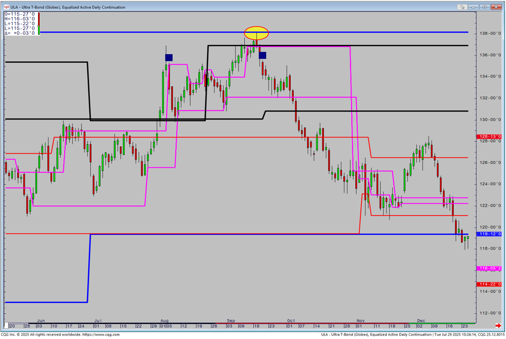 From this study that are a variety of patterns that can be programmed. The first is a measurement of when price is overbought or oversold and then if we have reversed. In an uptrend, the weekly high deviation is above the monthly high and the monthly high is above the quarterly. This tells us we are in a strong trend, and with the continuous time splicing every week and month, this can remain the case for some time. The reversal is confirmed when price makes a daily close below the lower weekly deviation. The whole Bond curve recently produced patterns as marked.