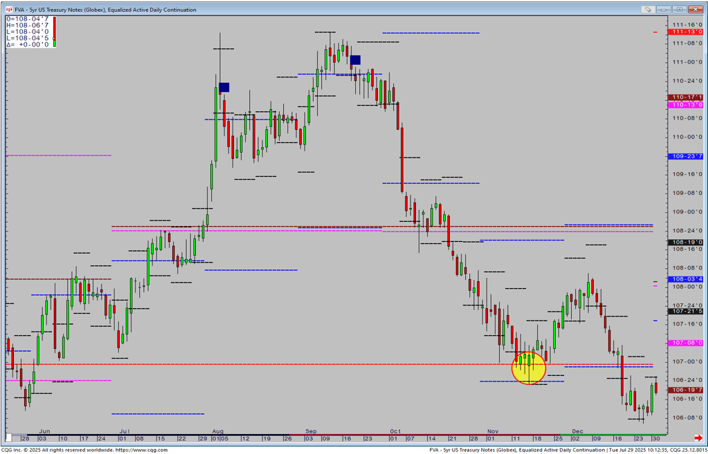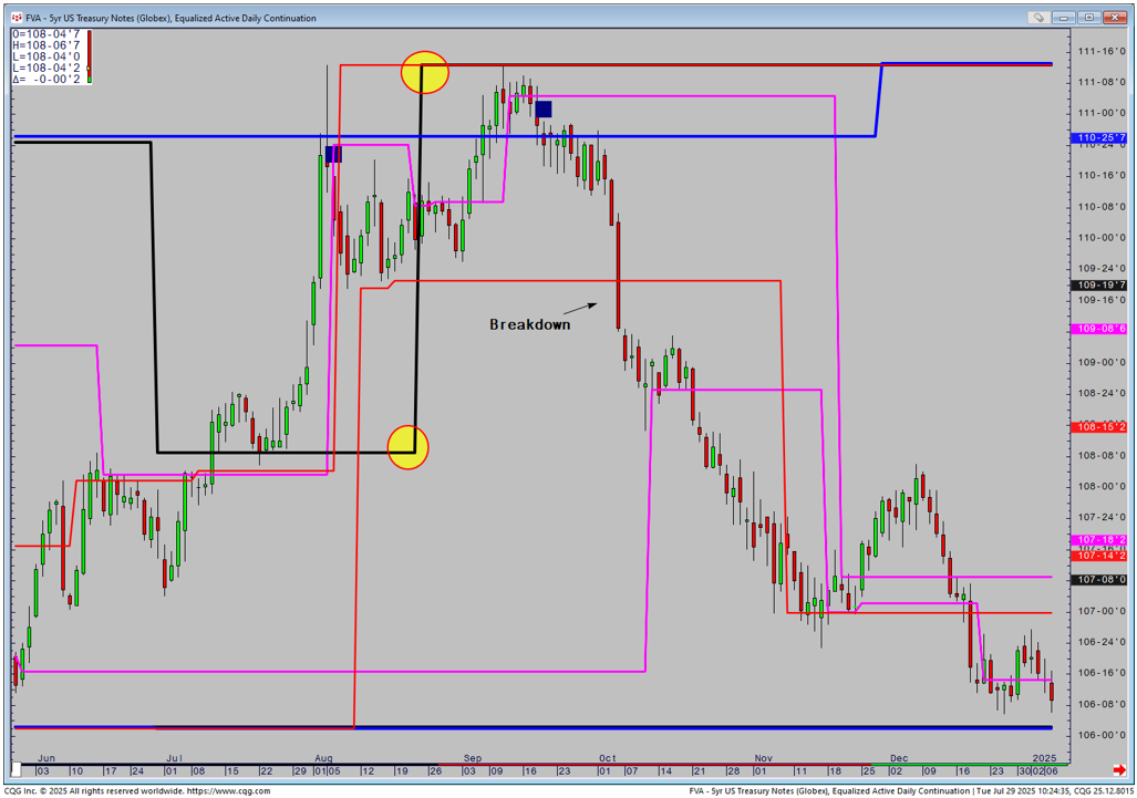 5 Years went 1 tick above the final resistance but took longer to reach the downside target than the rest of the curve.