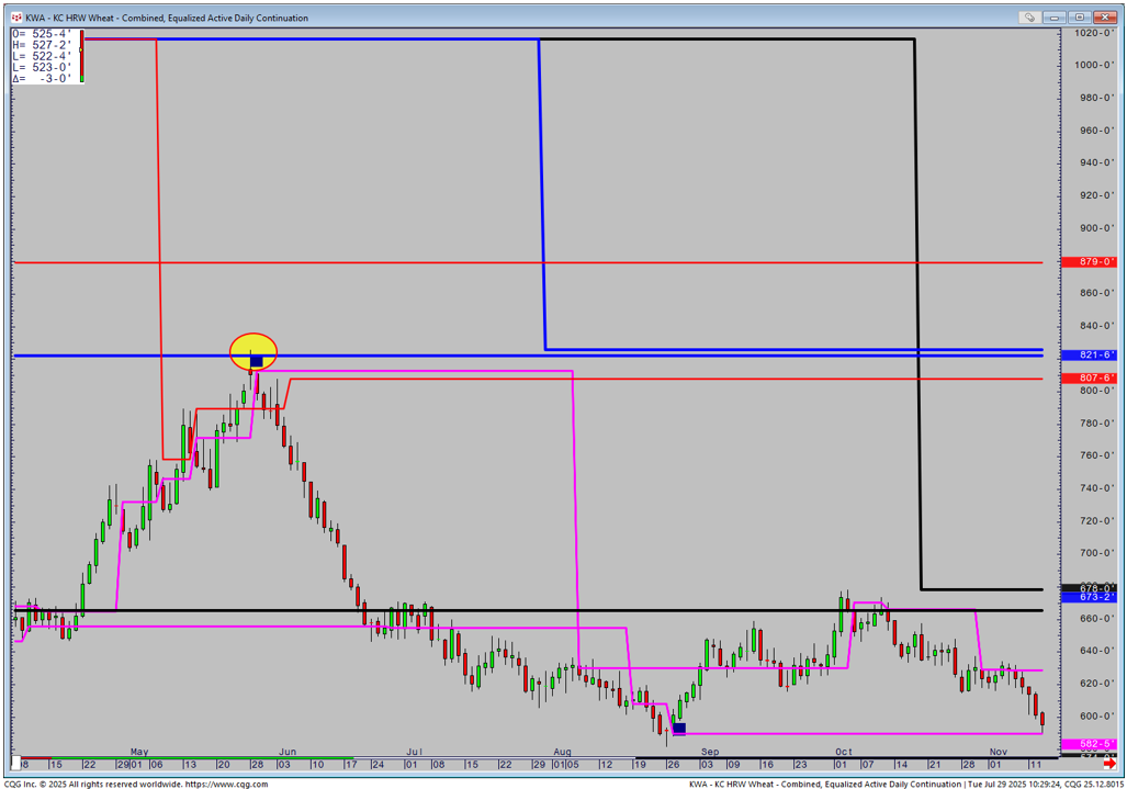 The normal Range Relativity was also in a set-up and produced the pattern. The weekly was below the monthly and monthly below the quarterly as circled, before closing back above the weekly high. Near the top some 6 months later, negative Range Relativity signals appeared.