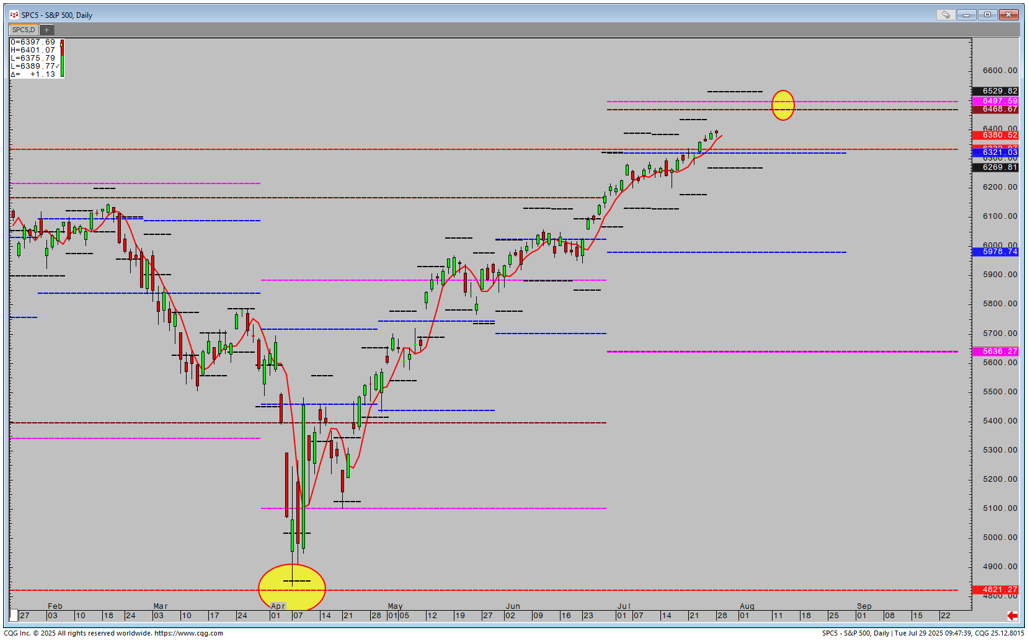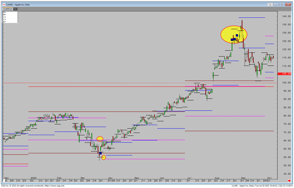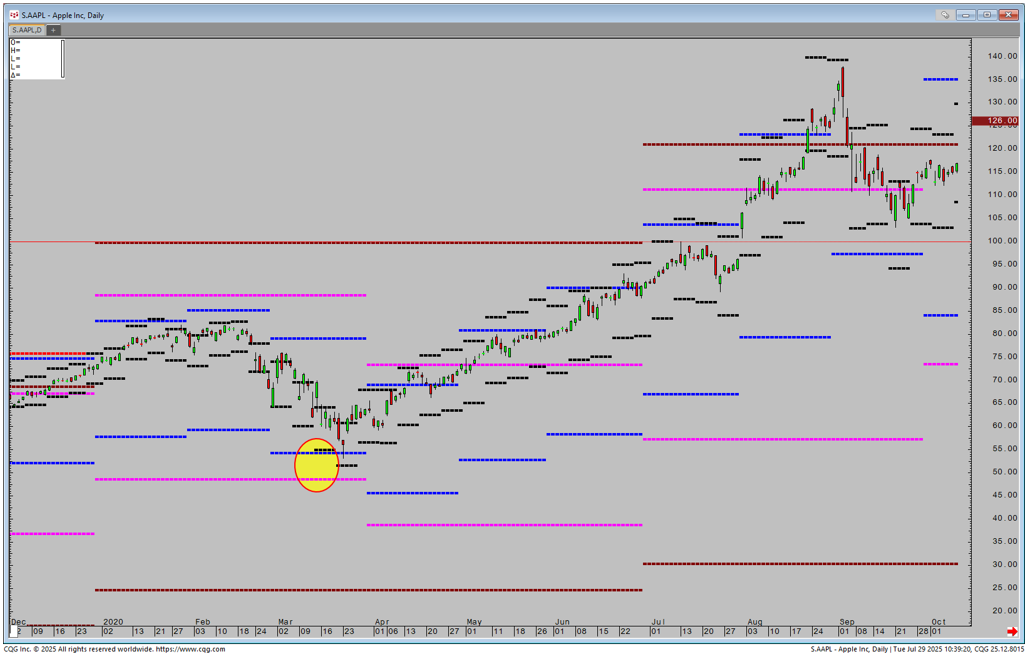 Range Relativity was born out of the application of multiple Timeframe Range Deviation Pivots. Previously I had Managed Funds purely in derivatives, before having the opportunity to do the same on American stocks. This presented a dilemma as my world had switched from 50 or so markets to thousands. Therefore I had to create a new suite of studies and patterns that were of sufficient rarity so that I would not be overrun with signals. Range Relativity is one such study and pattern. Stocks are also often less volatile intraday, and the uptrends can last far longer. Therefore the Pivots are applied to a daily chart and compute weekly, monthly, quarterly, semi-annual and annual data if there is sufficient history. These are just the 1st deviation up and down. The study can look messy and uninformative at first glance. Below is the S&P cash chart. The steep fall in April got very close to the final support and yearly level. Now, during the rally we have reached the yearly the other way, but as the new quarter and half year has begun a new set of levels have appeared as major zone above. This shifting through time and the resetting of levels is a crucial component in understanding where price can go and when it will stop.