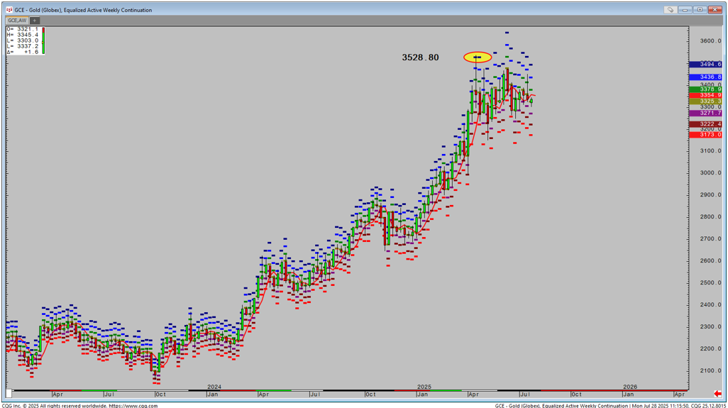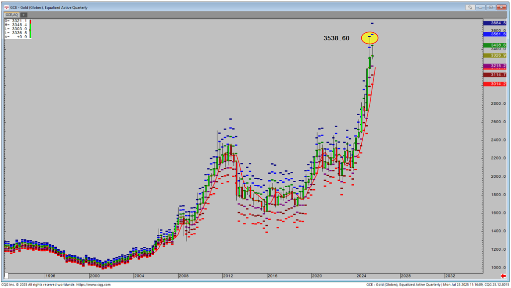 The use of multiple timeframe pivots are particularly useful if looking for a confluence, especially of an extreme or at times when we are trading at prices never seen before or for a very long time. The recent high in Gold in April is a prime example. Everyone knows the trend is up but there is very little analysis of where price can go and more importantly where it should stop. As price accelerated in April, the weekly limit of range lay at 3525.80. More importantly the quarterly limit of range was just above at 3538.60, thus creating a multiple timeframe zone extreme. The high was within it at 3537.90.