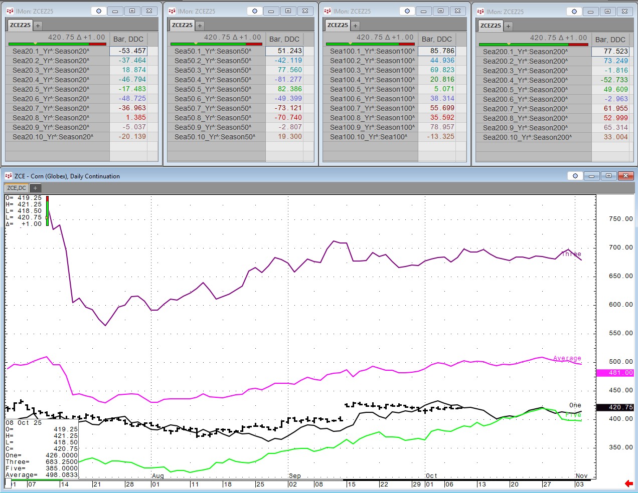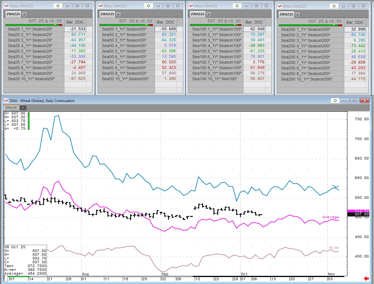 Each Wednesday this article will be updated with the current seasonal study using CQG's Seasonal analysis applied to the Soybean, Wheat and Corn markets. You can download the CQG pac providing the studies and charts here. In addition, the seasonal data lines can be pulled into Excel using RTD formulas.