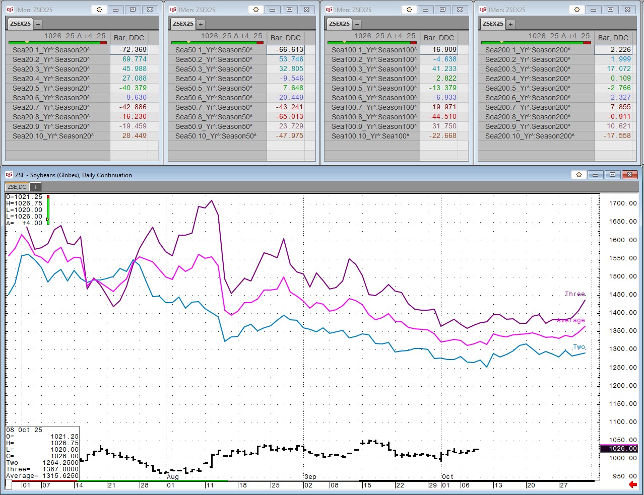 Below each chart are two tables. The first table is the highest correlation of the current market data to the seasonal year using a 20-day, 50-day, 100-day and the 200-day lookback periods. The second table is the previous week's data. Seasonal analysis is about price direction or the trend.