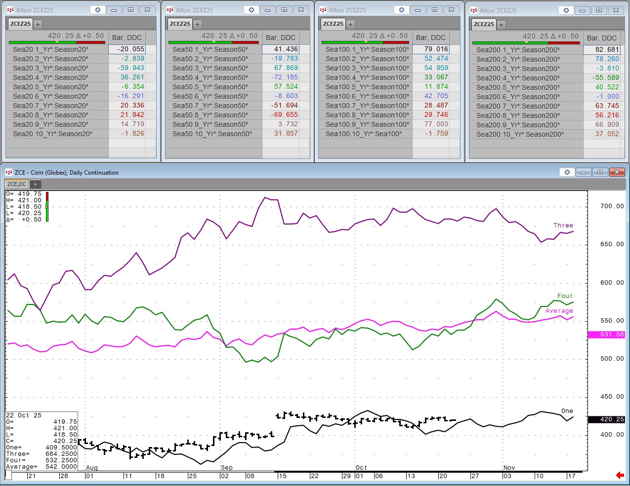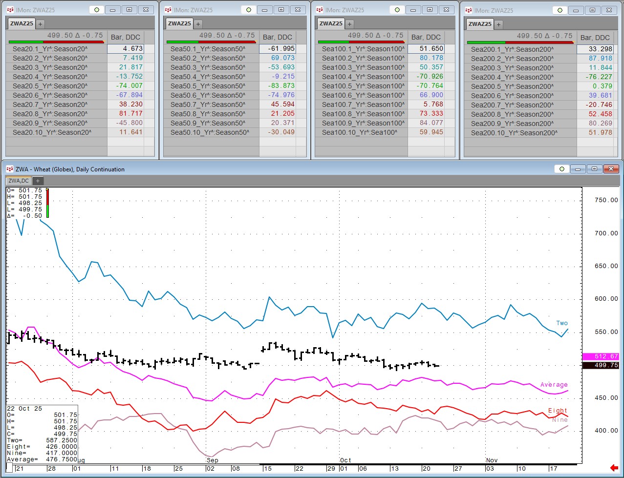 Each Wednesday this article will be updated with the current seasonal study using CQG's Seasonal analysis applied to the Soybean, Wheat and Corn markets. You can download the CQG pac providing the studies and charts here. In addition, the seasonal data lines can be pulled into Excel using RTD formulas.