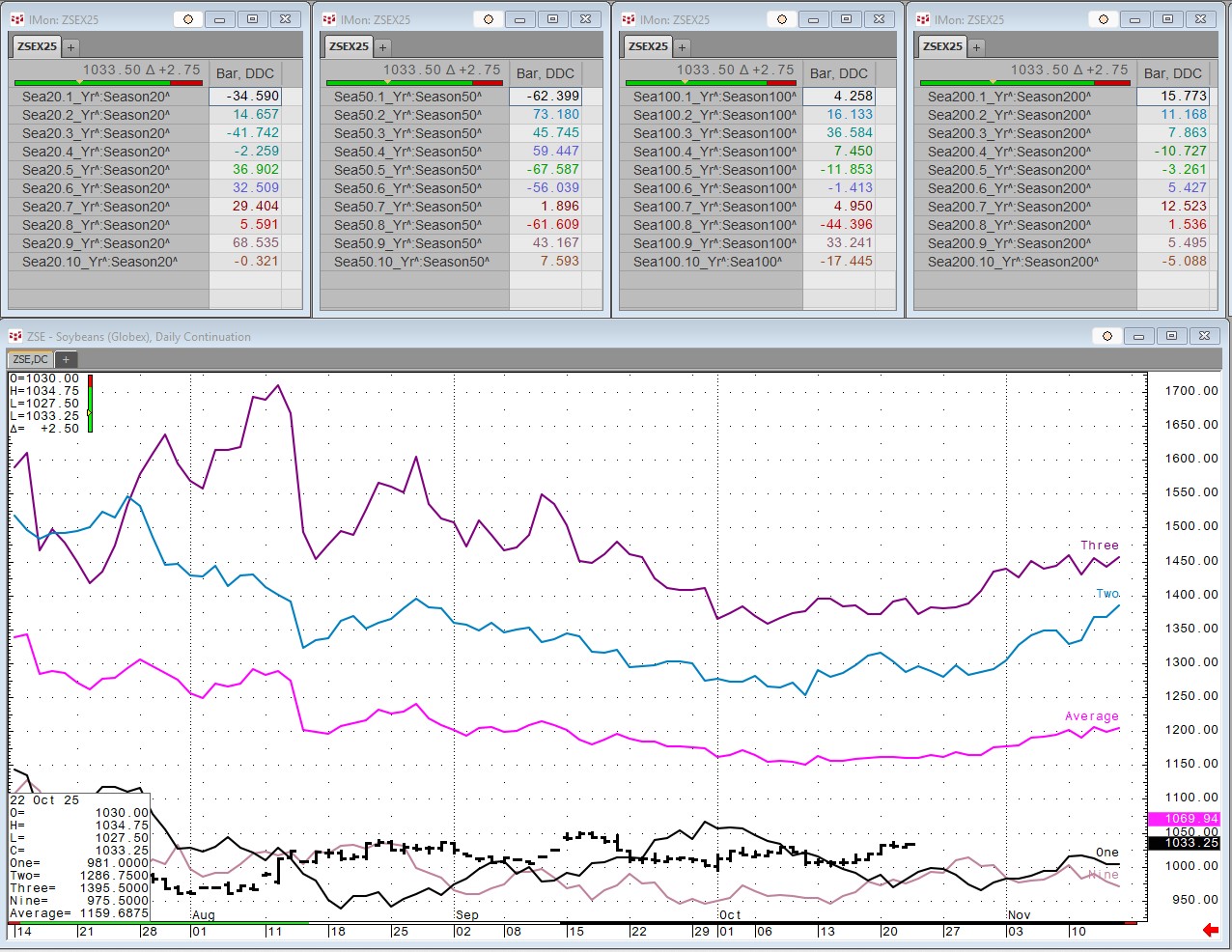 Below each chart are two tables. The first table is the highest correlation of the current market data to the seasonal year using a 20-day, 50-day, 100-day and the 200-day lookback periods. The second table is the previous week's data. Seasonal analysis is about price direction or the trend.