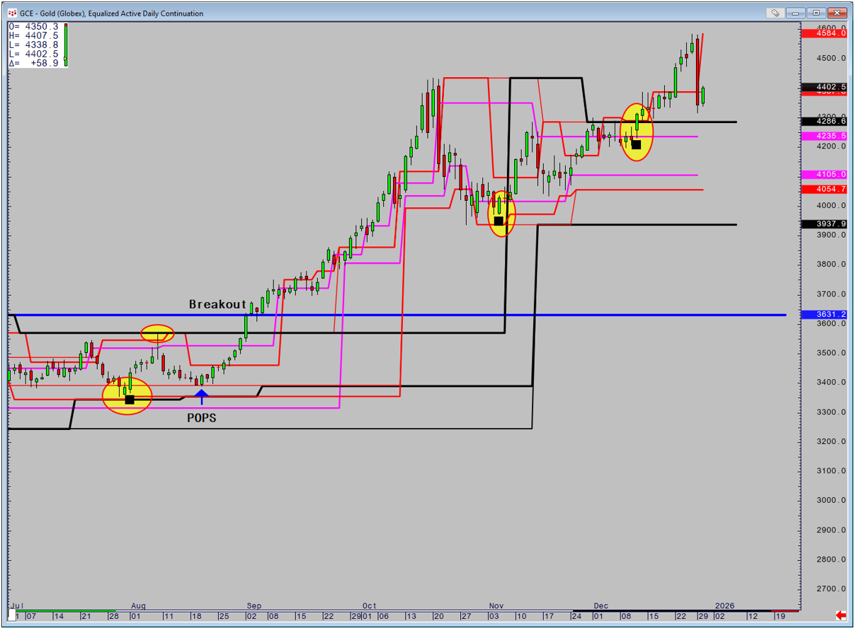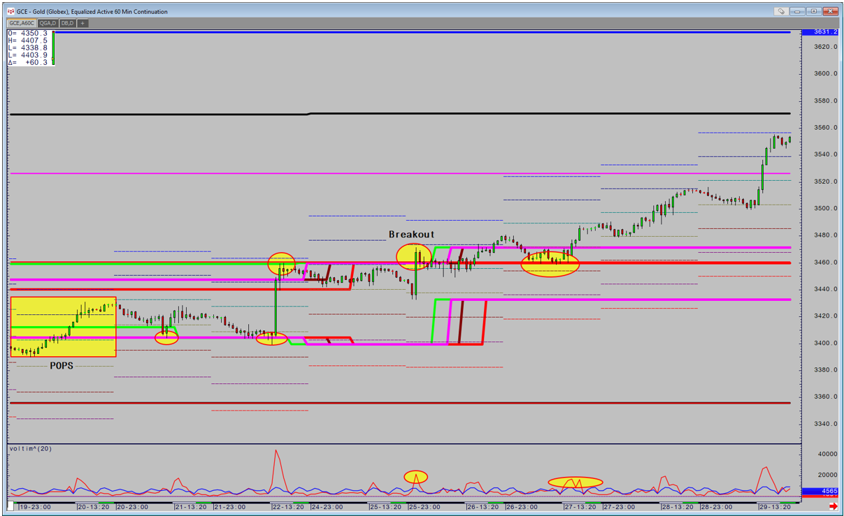 Gold has seen examples of all three. Looking at the chart below, the first pattern is within a large sideways grind, but the low held just above powerful weekly based support. After the signal, price rallies but tops out at the first major upside target at the weekly based resistance (black line, second circle). Price retreats before a POPS signal appears and the rally begins once more.