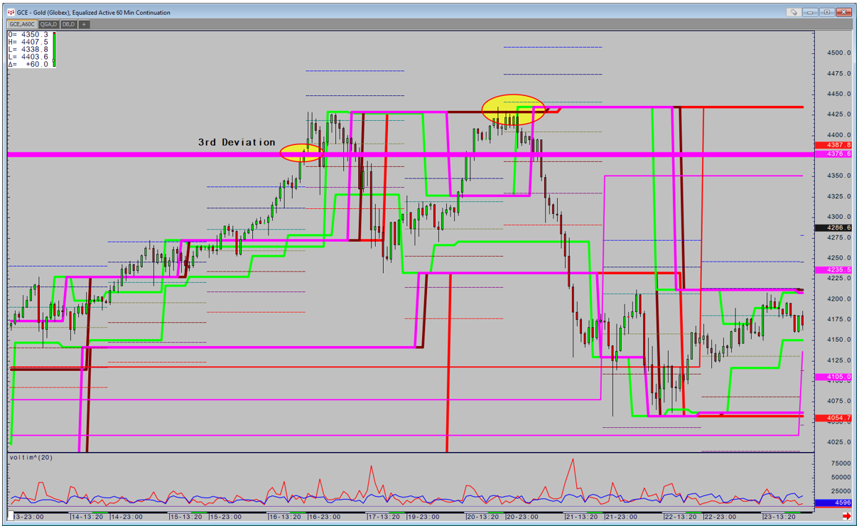 The chart shows the 3rd Deviations from Weekly to Quarterly (black, blue, pink). Price reaches the Quarterly point, which is rare for any market to achieve. It is even rarer to achieve this just 3 weeks into the quarter and tells me that the market is overextended. Note that price did also reach the 3rd Quarterly Deviation in September but right at the end of the month. This distinction is critical as it will only be a matter of days before the levels reset as the new quarter begins. This highlights how the splicing of time in relationship to the traditional way of continuous momentum is crucial in providing the studies power.