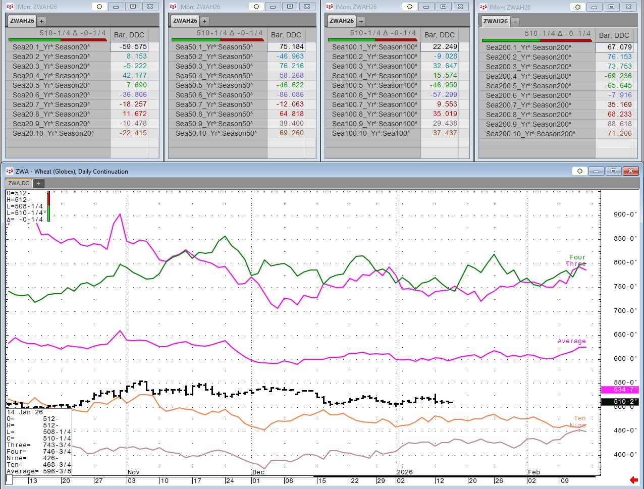 Each Wednesday this article will be updated with the current seasonal study using CQG's Seasonal analysis applied to the Soybean, Wheat and Corn markets. You can download the CQG pac providing the studies and charts here. In addition, the seasonal data lines can be pulled into Excel using RTD formulas.