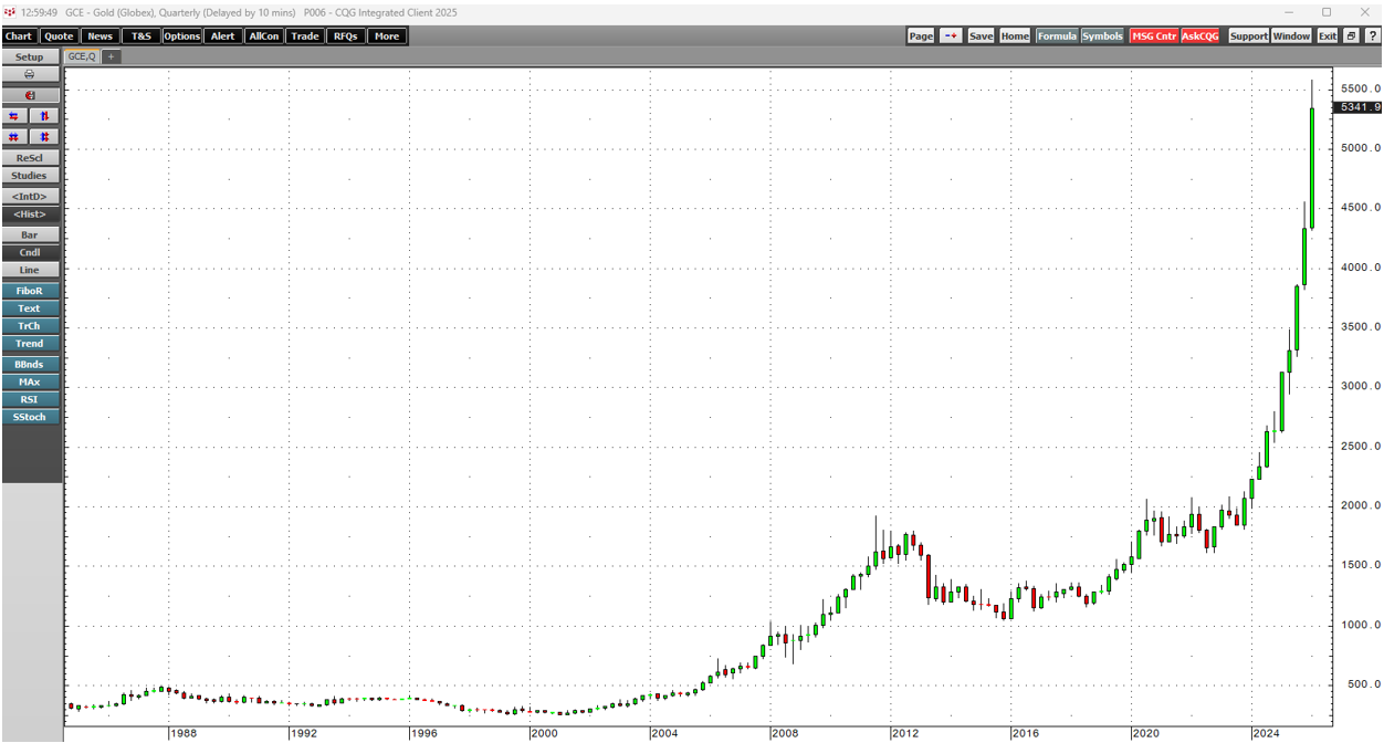 The quarterly chart shows that nearby gold futures prices rose 28.7% during the first month of 2026, to a high of $5,586.20 per ounce on January 29. At over $5,350 per ounce, gold was over $1,000 higher than the price one month earlier.