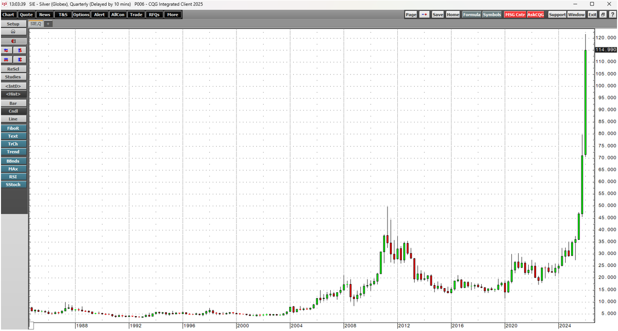 Nearby COMEX silver futures reached $121.785 per ounce on January 29, 72.5% higher than the price at the end of December 2025. At over $114 per ounce, silver futures were over $40 higher in just under one month.