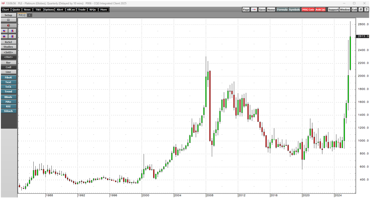 After years of trading in a sideways consolidation pattern around the $1,000 per ounce pivot point, NYMEX platinum futures broke out to the upside in 2025.