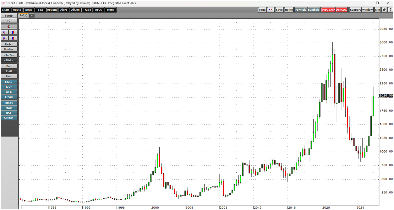 The quarterly chart illustrates the bullish pattern in palladium futures, which took the least-liquid precious metals futures contract 32.9% higher from its 2025 closing level, reaching $2,195.50 per ounce in January 2026.