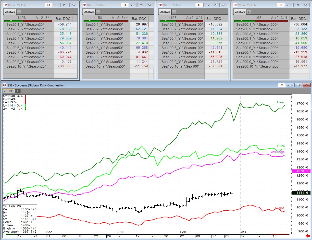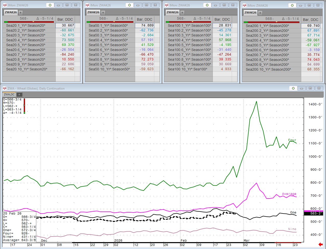 Each Wednesday this article will be updated with the current seasonal study using CQG's Seasonal analysis applied to the Soybean, Wheat and Corn markets. You can download the CQG pac providing the studies and charts here. In addition, the seasonal data lines can be pulled into Excel using RTD formulas.