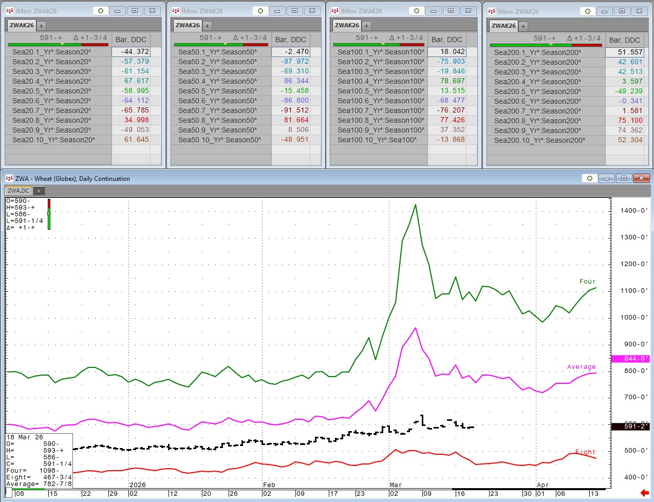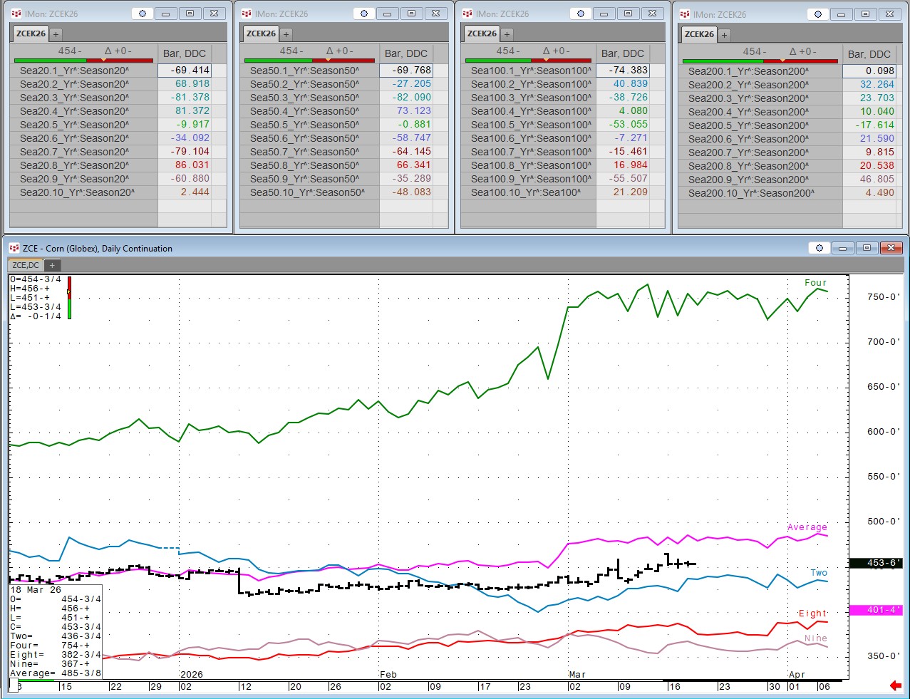 Each Wednesday this article will be updated with the current seasonal study using CQG's Seasonal analysis applied to the Soybean, Wheat and Corn markets. You can download the CQG pac providing the studies and charts here. In addition, the seasonal data lines can be pulled into Excel using RTD formulas.