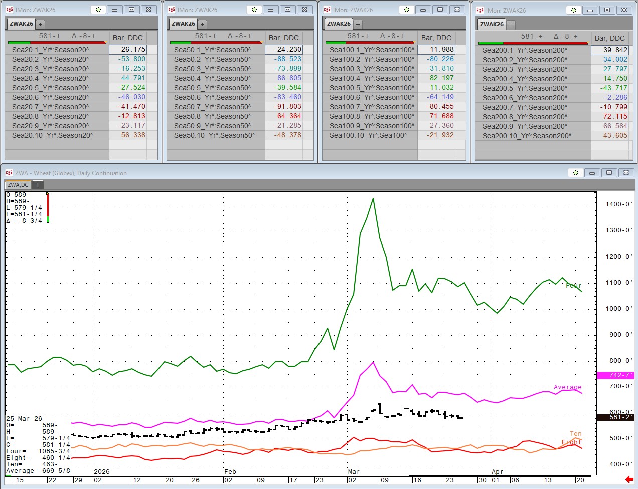 Each Wednesday this article will be updated with the current seasonal study using CQG's Seasonal analysis applied to the Soybean, Wheat and Corn markets. You can download the CQG pac providing the studies and charts here. In addition, the seasonal data lines can be pulled into Excel using RTD formulas.