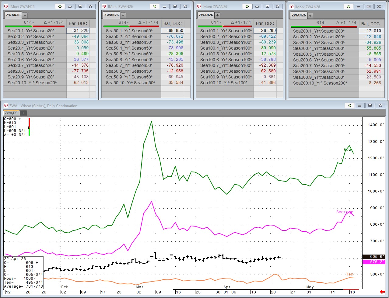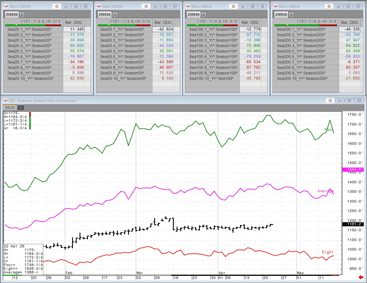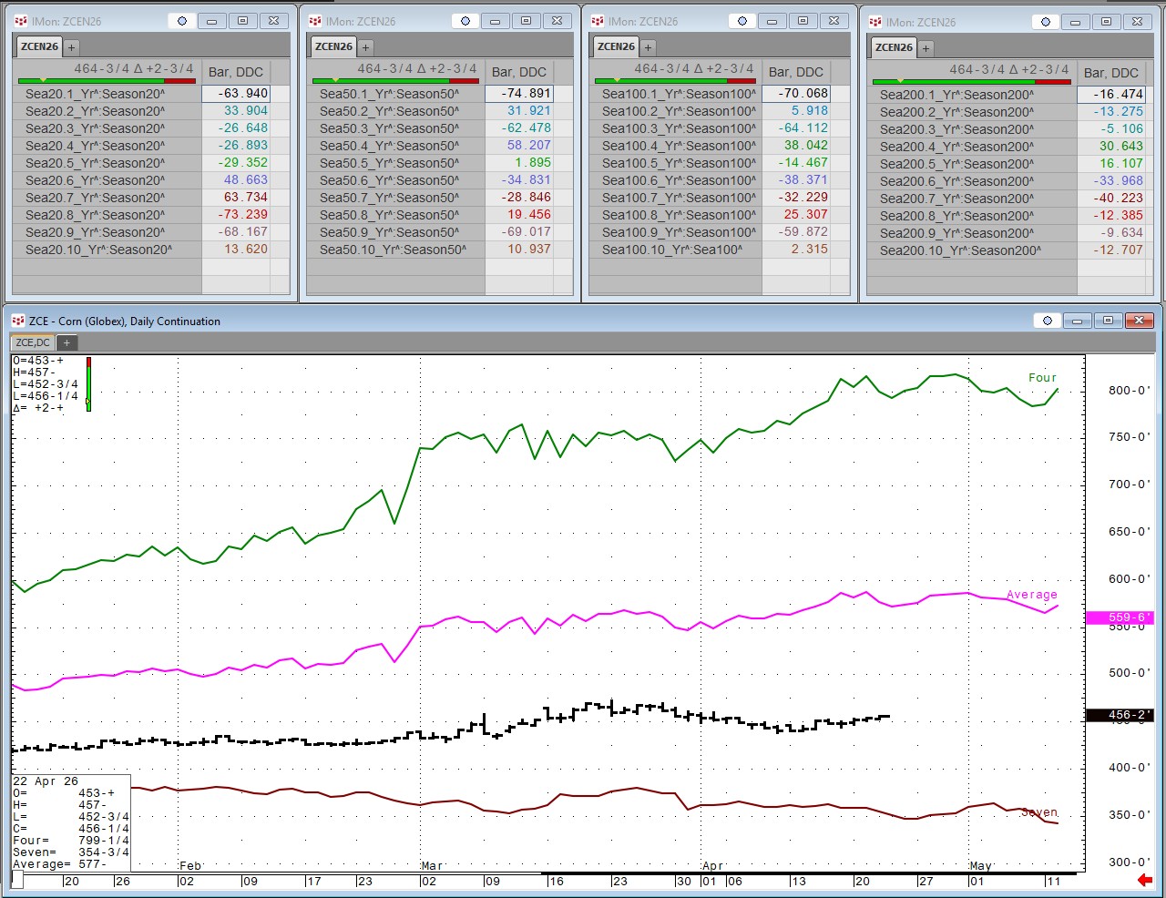 Each Wednesday this article will be updated with the current seasonal study using CQG's Seasonal analysis applied to the Soybean, Wheat and Corn markets. You can download the CQG pac providing the studies and charts here. In addition, the seasonal data lines can be pulled into Excel using RTD formulas.