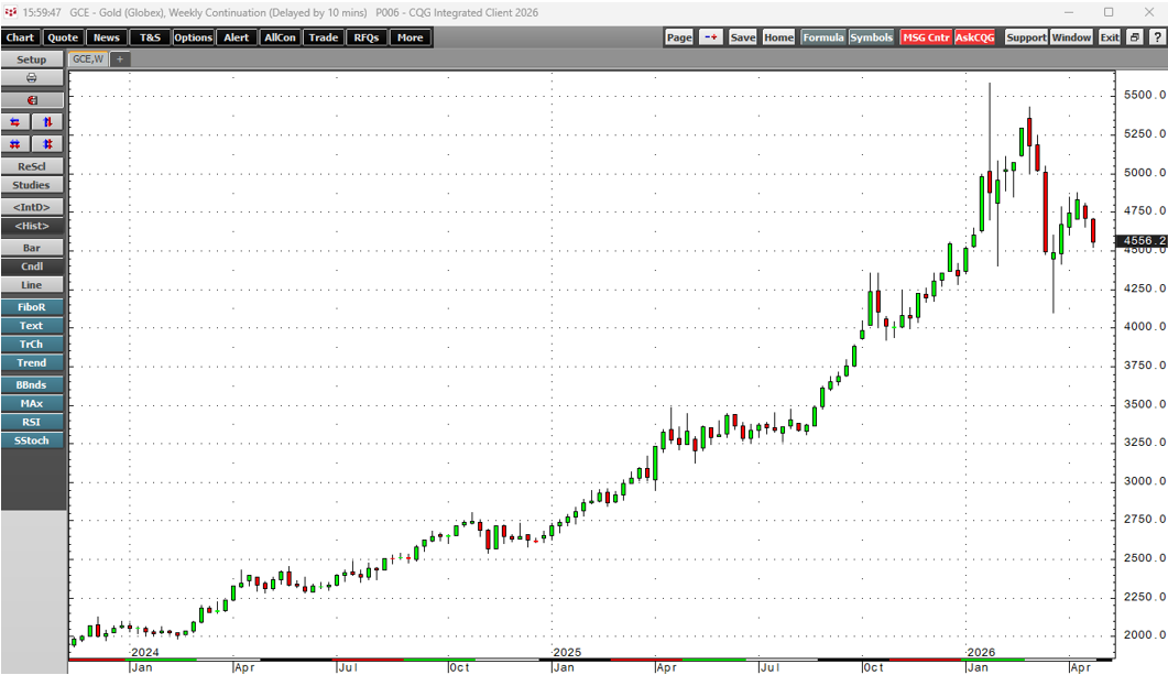 The weekly gold chart highlights the 26.6% correction that took gold futures to a low of $4,100.00 per ounce on March 23, where it found a bottom. While gold lost over one-quarter of its value in a si'"ngle month, the price plunge did not negate its long-term bullish trend.