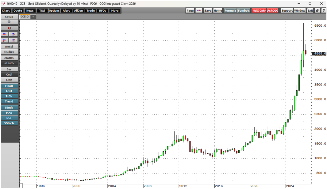The long-term quarterly COMEX gold futures chart highlights the bullish trend has continued since the late January through March 2026 correction.