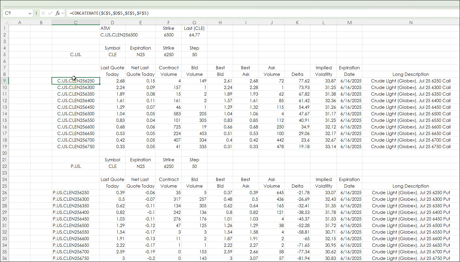 This post walks the reader through building option chains in Excel. The CQG RTD Toolkit offers this functionality, however, the same feature can be implemented using Excel's CONCATENATE function. This post details both approaches.