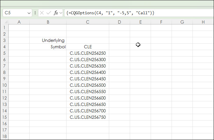 You can enter in the contract symbol or a cell reference with the symbol. The latter is recommended because the symbol list is an "array" in Excel which cannot be edited. By using a cell reference you can easily change the symbol. The next image is an example of the call options list of ten call symbols, five above the at-the-money (ATM) and five below the ATM.