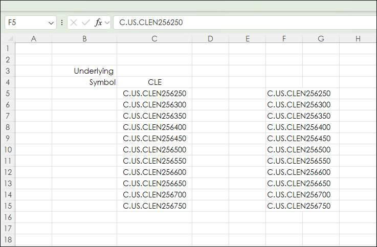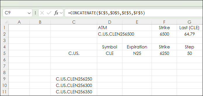 Notice above in the formula bar there is not a request for a specific option symbol with a strike price. The way the formula works is it pulls in the ATM in the center. What can happen is the ATM can change. Then the list of symbols will change. If you want a fixed set of symbols, then copy the symbols list and paste as "Values." In the next image the symbols were pasted as values in column F and the symbols are fixed.