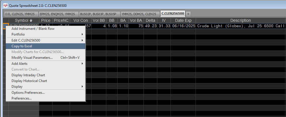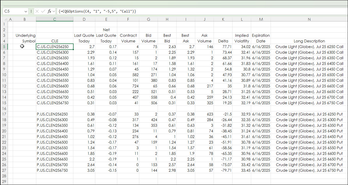 With a list of symbols, the CQG Quote Spreadsheet V2 can be used to write RTD formulas for market data and option Greeks. Select Options and use the CQG Quote Spreadsheet V2 to build a single row of data.