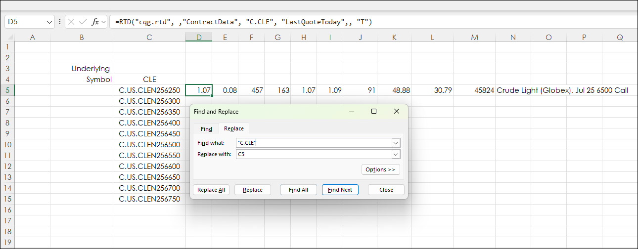 Paste the formulas next to the first symbol. The data brought over from the CQG Quote Spreadsheet V2 will include the symbol. Delete that cell and shift the formulas to the left. Next, replace the symbols in each RTD formula with the cell reference using Excel's "Find and Replace" feature.