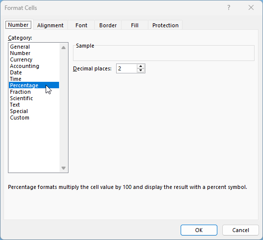 The cell then needs to be formatted as a percentage value. Right-click the cell, select Format Cells and then choose "Percentage."
