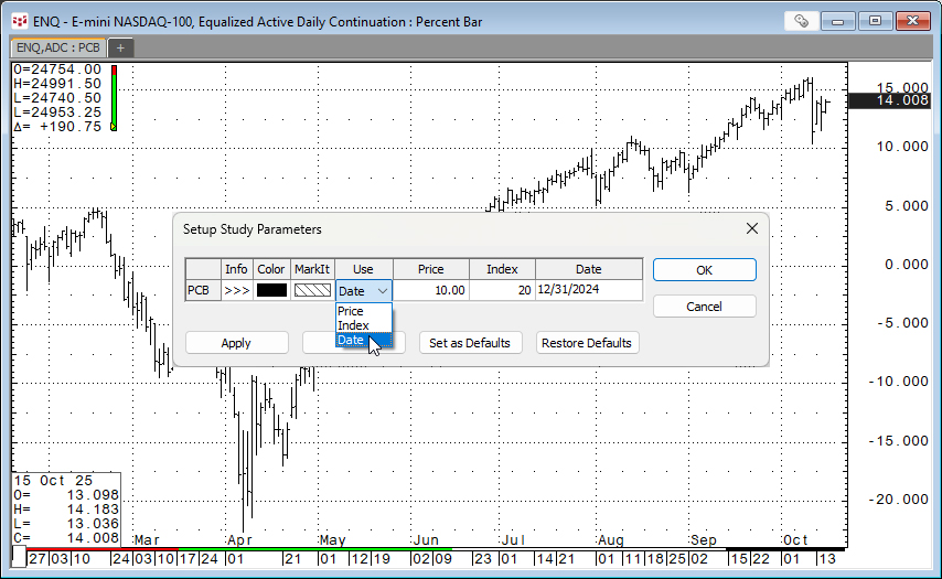 Next, is using Study Data RTD formulas for determining percent net change. The Study Data is pulling in the Percent Bar chart data. The next image shows a Percent Bar chart using the Date parameter. The chart displays the percentage net change from 12/31/2024.