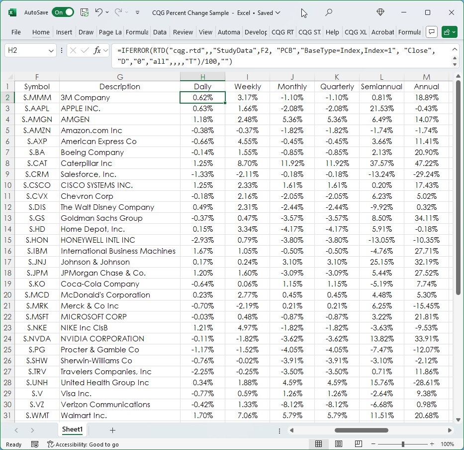The Excel IFERROR function is added to the RTD Percent Net Change formulas for the listed time frames.