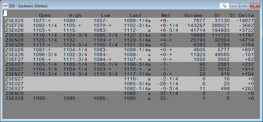 First, an overview of the All Contracts display. Below the image displays the All Contracts window. Simply enter in a root symbol and the display populates all the current contracts. This display automatically rolls.