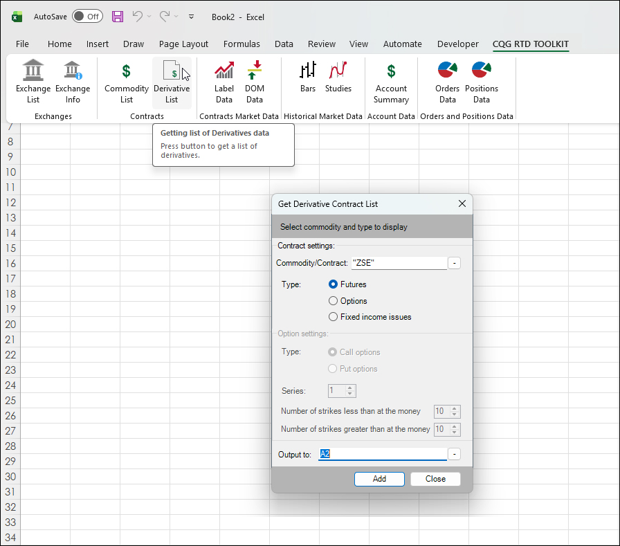 To create an Excel version starts with using the CQG RTD TOOLKIT, select Derivative List, and in the UI enter the symbol (here, "ZSE"), select Futures, and the cell for the first symbol (A2) in the list of symbols. The start is cell A2 so the column can have the label "Symbol" added.