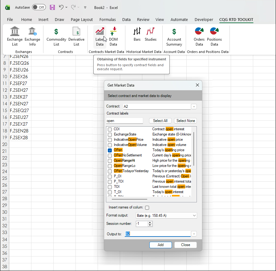 With the symbols added to column A, the next step is select "Label Data", enter cell A2 for the first symbol, in the Contract labels window enter open, select Open, the Format output is BATE, and the output is to cell B2.