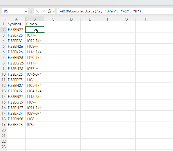 Notice that cell B2 does not display a value. There is a bug in the CQG RTD TOOLKIT. The Add-In pulls an expired contract for the first cell. The Workaround is the second row will be hidden.