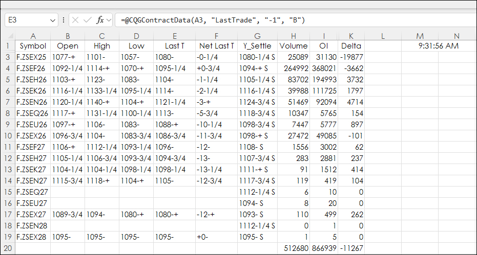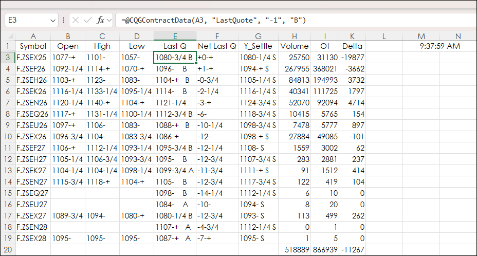 =RTD("cqg.rtd",,"StudyData",A3, "Bar",, "ContractOI", "D", "-2",,,,,"T")To modify this spreadsheet for your markets, replace the symbols in column A using the Derivative List with your symbol (Use all capital letters) and copy and paste or delete the other rows down to line up with the symbols.