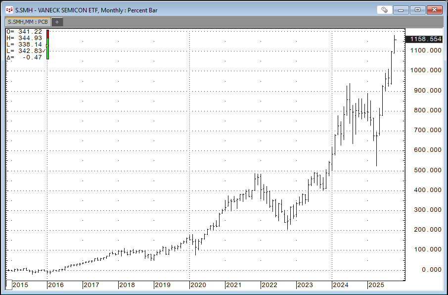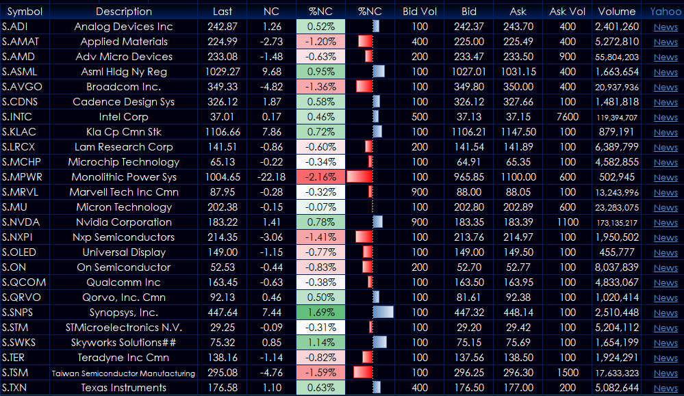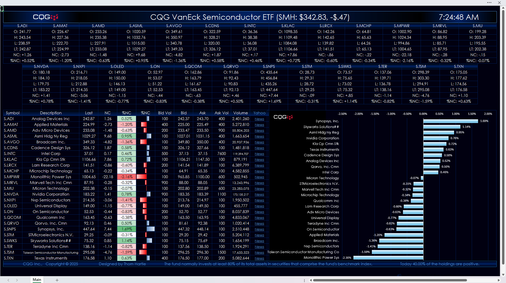 The post offered a CQG IC or QTrader PAC of a page for tracking the ten ETFs. This post offers an Excel Dashboard that tracks the holdings of the VanEck Semiconductor ETF.