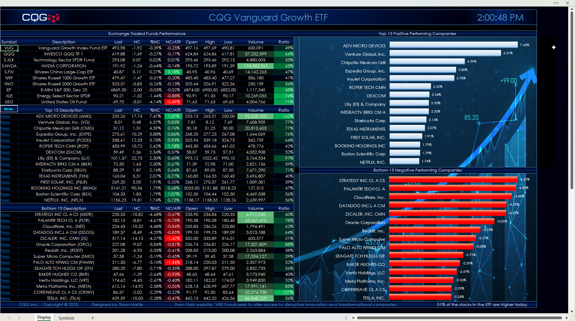 Below is an image of the downloadable Excel Dashboard. During the trading session, the Excel dashboard dynamically ranks the individual stocks held by VUG. The Excel dashboard displayed below shows the top and bottom fifteen performers as histogram bar charts, along with their respective net percent change for today's trading session.