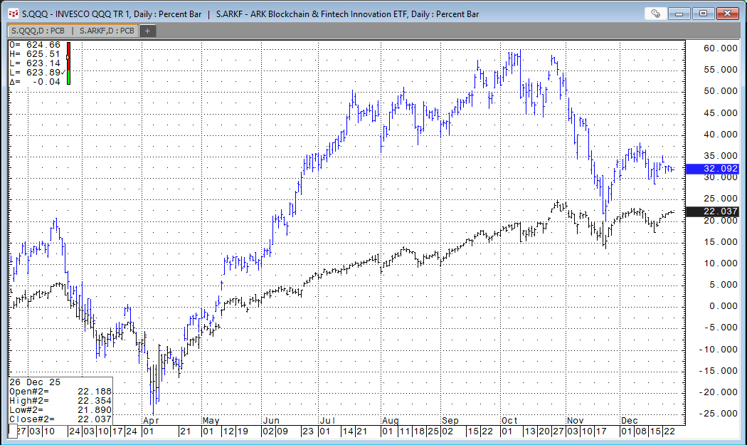 The chart below is the percentage net change from 12/31/2024 for the QQQ ETF and the ARKF ETF. Currently, the ARKF ETF is up over 32%.
