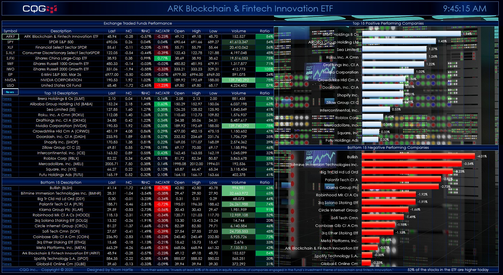 From the ARK website: "ARKF is an actively managed Exchange Traded Fund (ETF) that seeks long-term growth of capital. It seeks to achieve this investment objective by investing under normal circumstances primarily (at least 80% of its assets) in domestic and foreign equity securities of companies that are engaged in the Fund's investment themes of blockchain and financial technology ("Fintech") innovation": ARKF Overview.