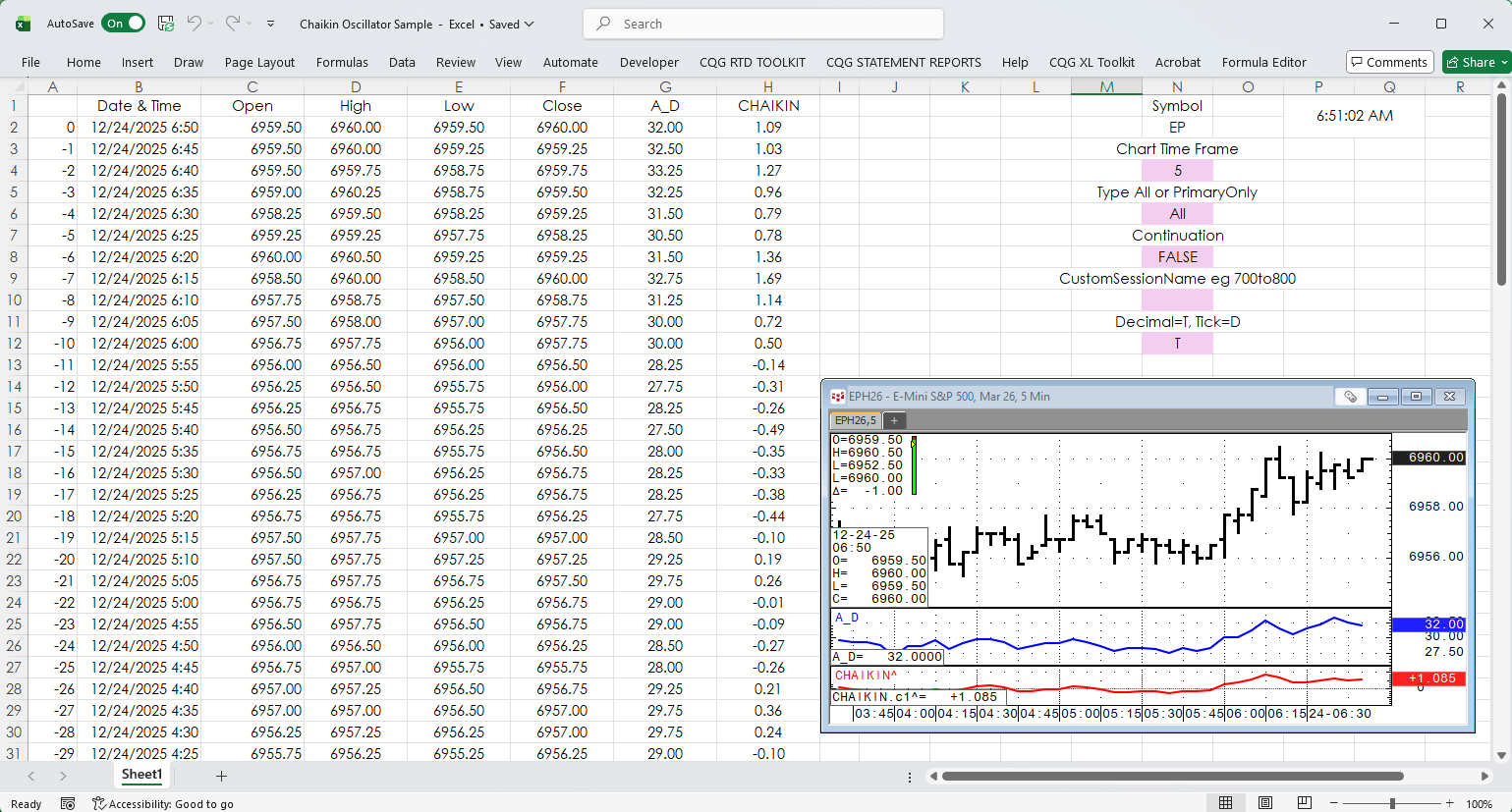 =RTD("cqg.rtd",,"StudyData",$N$2, "A_D","", "A_D", $N$4, $A2, $N$6,$N$10,,$N$8,$N$12)=RTD("cqg.rtd",,"StudyData",$N$2, "CHAIKIN^","", "c1", $N$4, $A2, $N$6,$N$10,,$N$8,$N$12)The symbol is in cell $N$2 and the time frame is in cell $N$4 in the downloadable sample at the bottom of the post.