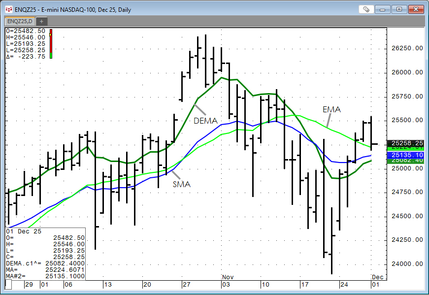 This chart below displays the DEMA (green line), Simple Moving Average (blue line), and an Exponential Moving Average (light green line), all using a lookback period of 21.