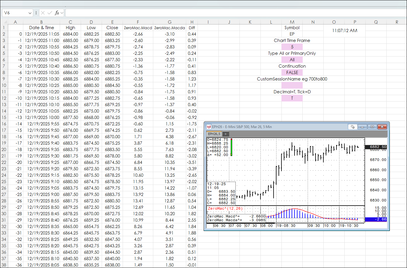 =RTD("cqg.rtd",,"StudyData",$M$2, "ZeroMac^","", "Macd", $M$4, $A2, $M$6,$M$10,,$M$8,$M$12)=RTD("cqg.rtd",,"StudyData",$M$2, "ZeroMac^","", "Macda", $M$4, $A2, $M$6,$M$10,,$M$8,$M$12)The two studies use the symbol in cell M2 and the time frame in cell M4.